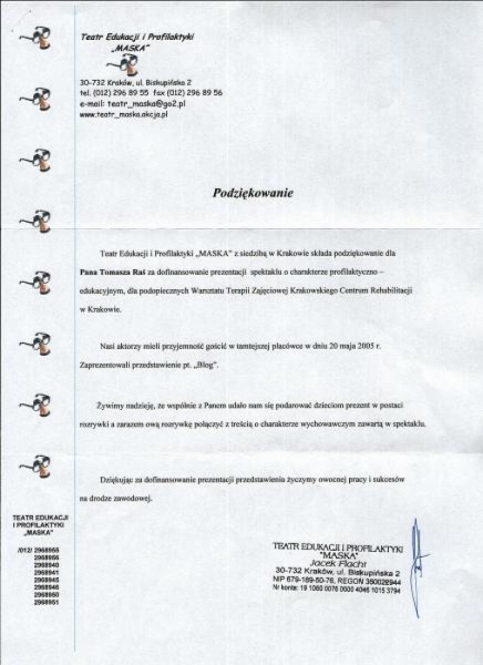 Podziękowanie za dofinansowanie spektaklu edukacyjnego