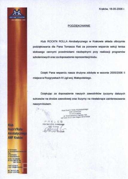 Podziękowanie za wsparcie dla sekcji tenisa stołowego
