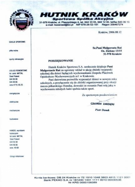 Podziękowania Klubu Żużlowego - Wanda Kraków